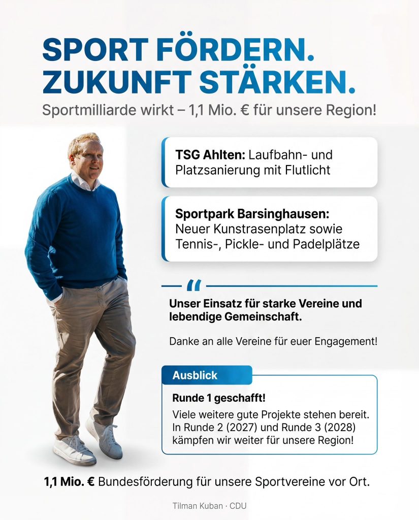 Gute Nachrichten für Barsinghausen: Der Haushaltsausschuss des Deutschen Bundestages hat die Mittel aus dem ersten Projektausruf der sogenannten „Sportmilliarde“ freigegeben. Davon profitiert auch der REWE-Sportpark – das frühere Waldstadion mit Tennisanlage – in Barsinghausen. Das teilte unser Bundestagsabgeordneter Tilman Kuban heute mit.